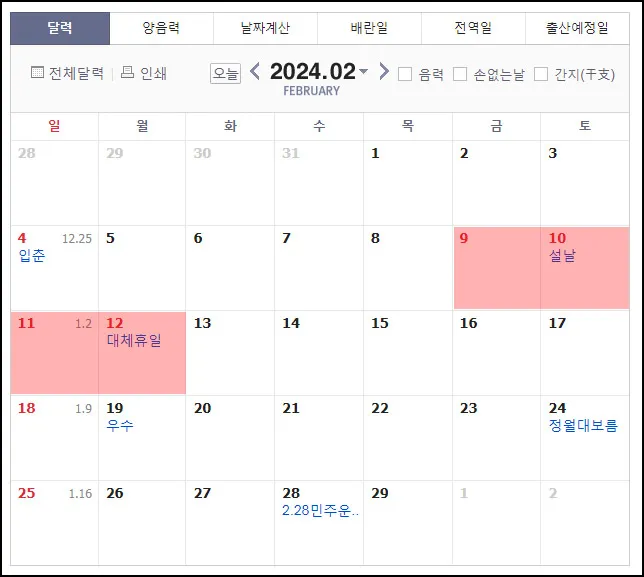 지금부터 2024년 달력을 보면서 공휴일 및 대체공휴일 알려드리겠습니다.